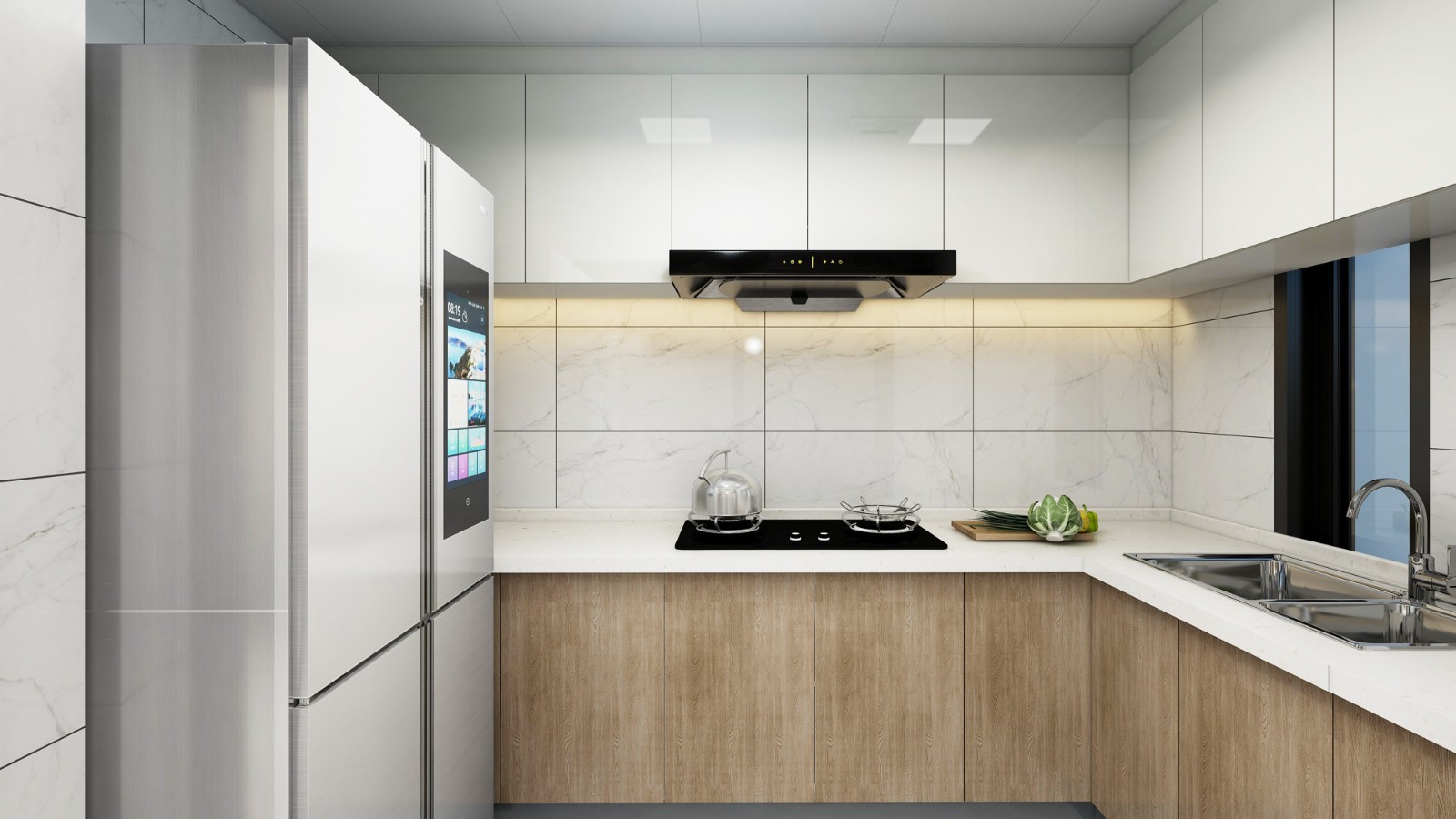 廚房頭頂上的吊柜與櫥柜,足夠的收納空間讓整個(gè)廚房變得十分簡潔,讓你愛上烹飪。
