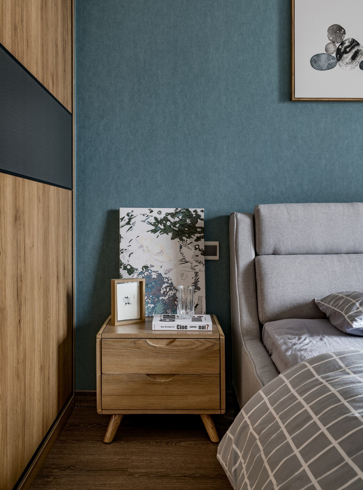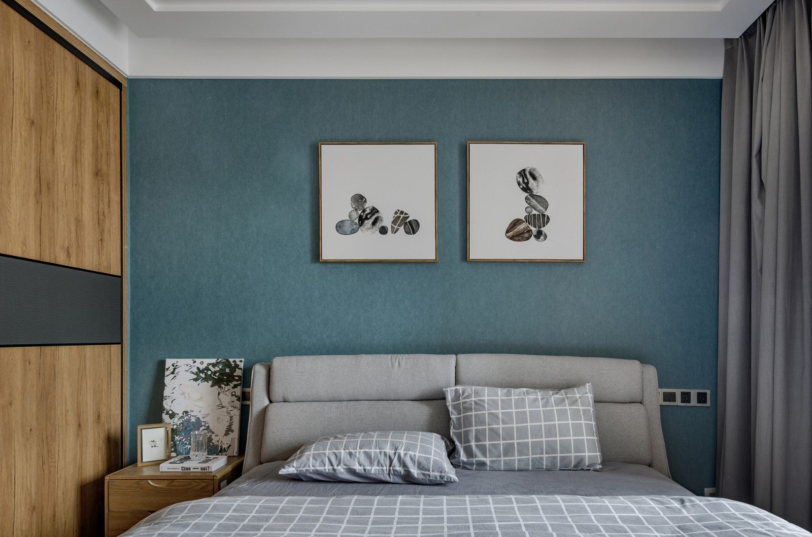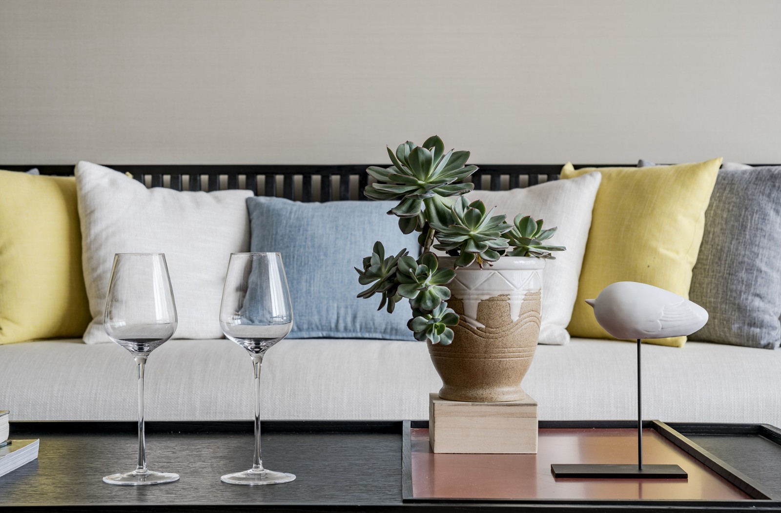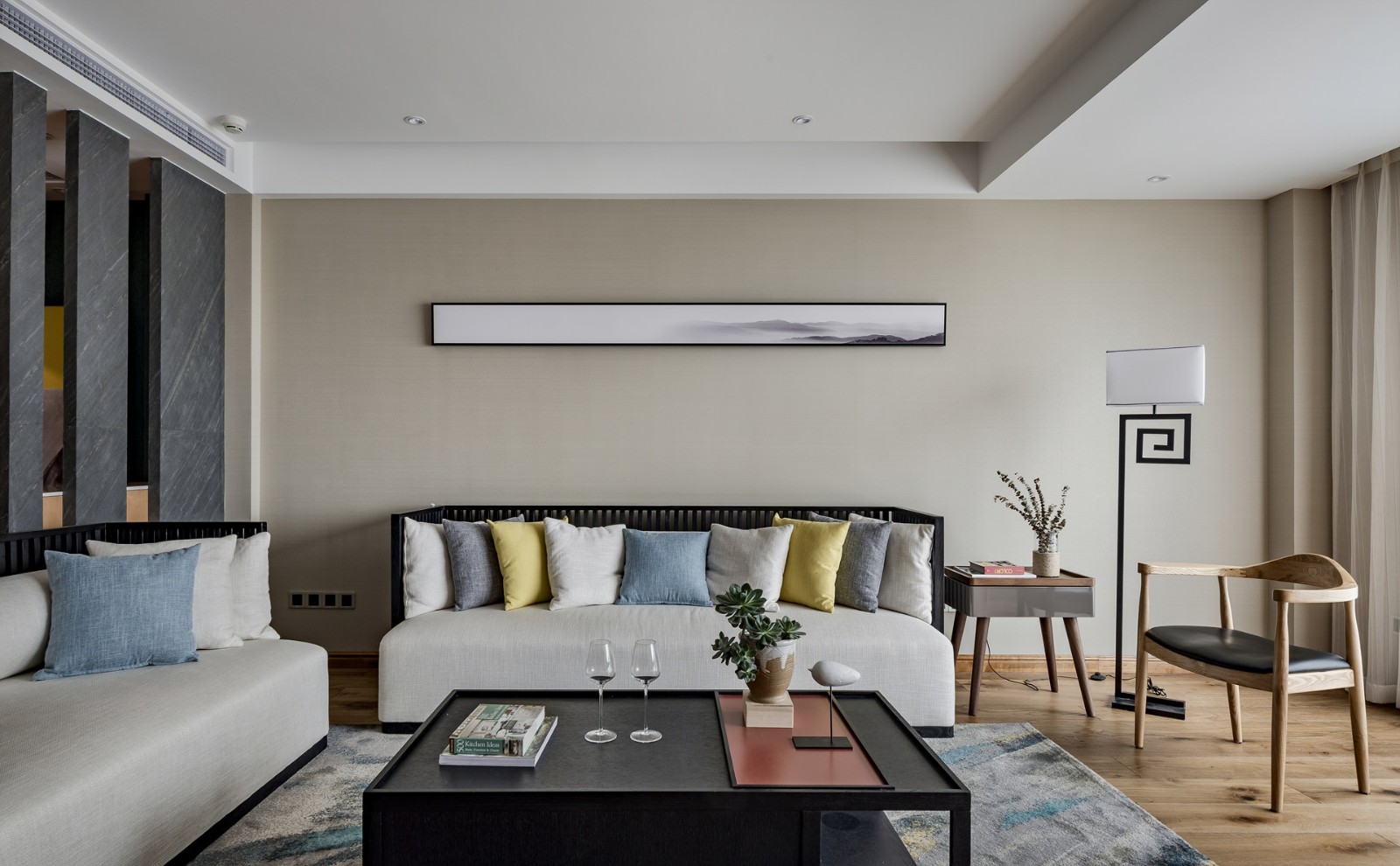 沙發(fā)背景墻珍珠白乳膠漆,新中式特有的落地?zé)?,簡單的一副山水掛畫就能體現(xiàn)業(yè)主的品味。