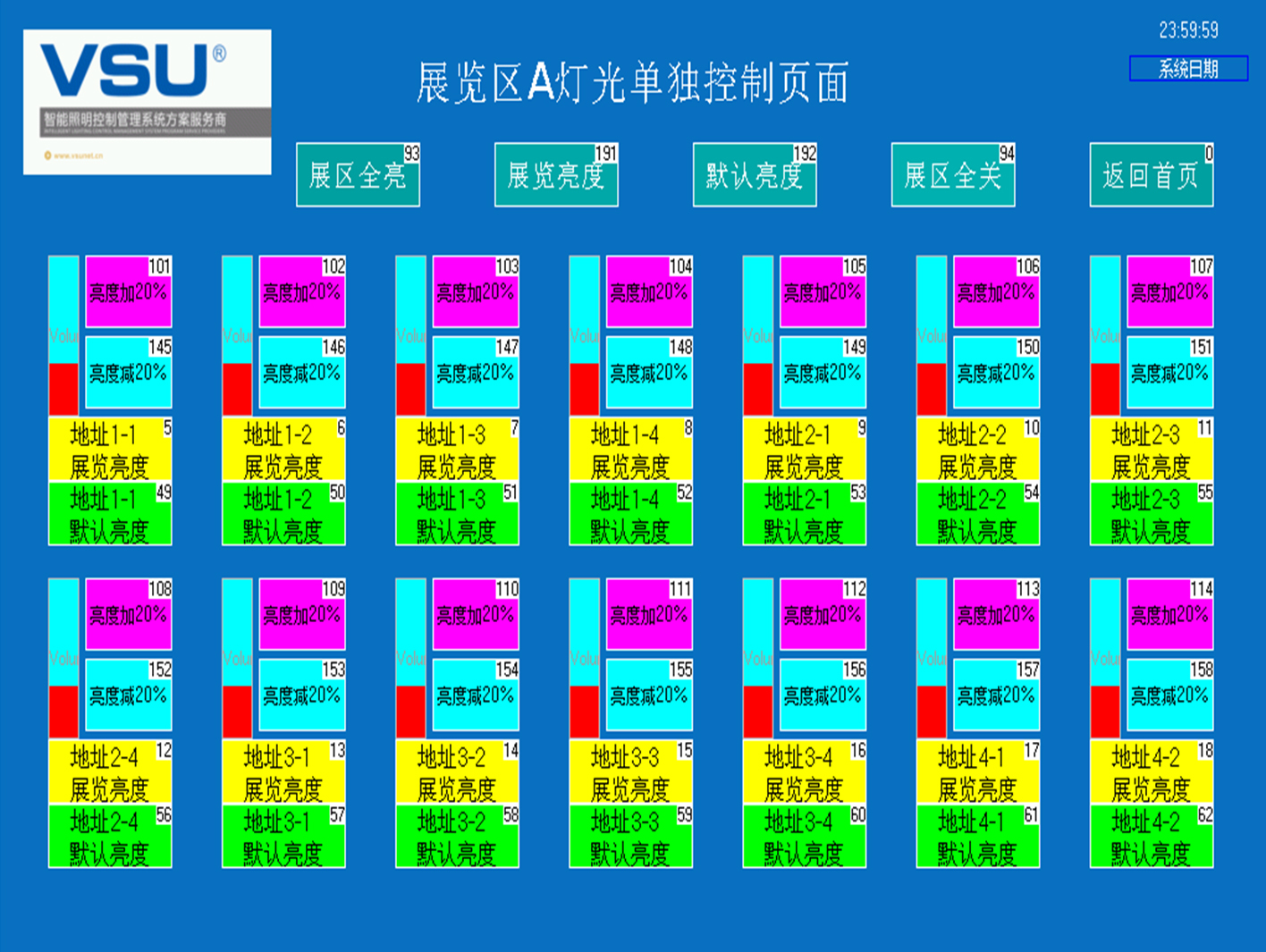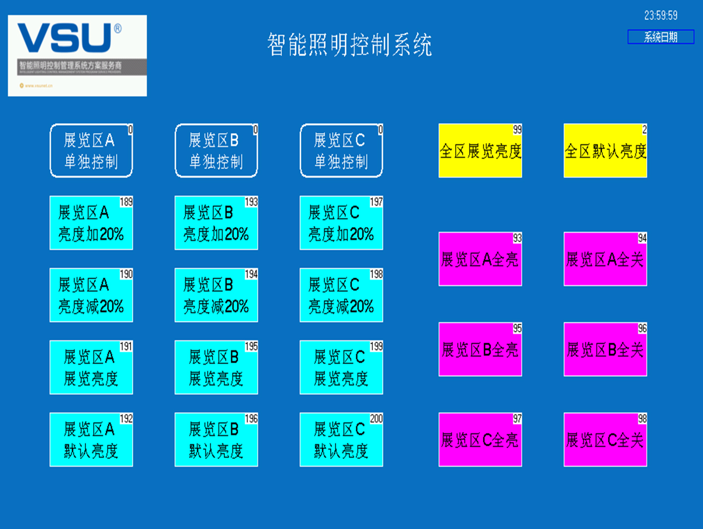 下圖為蓬萊閣智能照明項(xiàng)目控制界面: