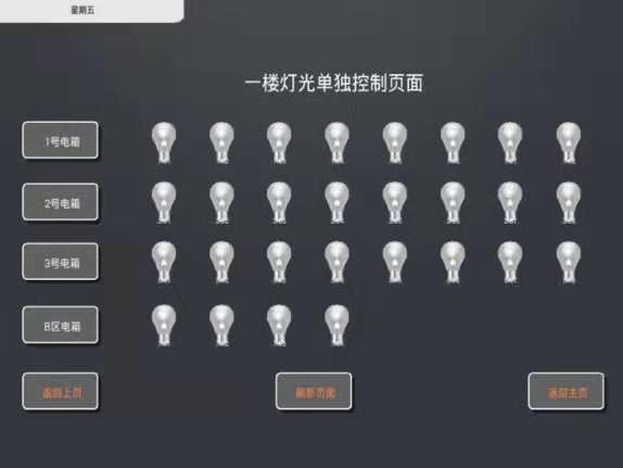 下圖為該項目的智能照明控制軟件截面圖,如圖所示,有電箱內(nèi)的回路單控,也有以樓層為單位作區(qū)域燈光控制的選項,以及所有系統(tǒng)內(nèi)的燈光一鍵全開全關(guān)的功能。