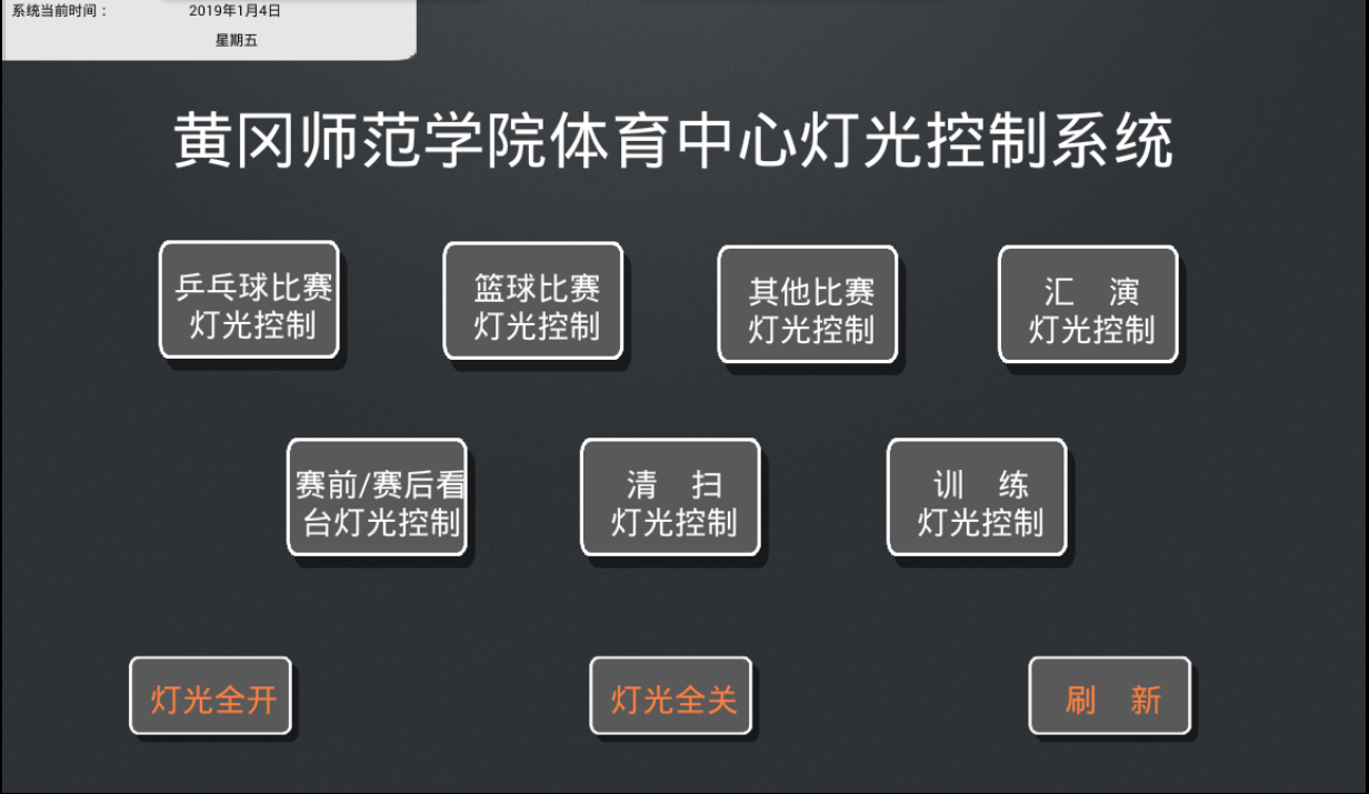 VSU為黃岡師范學(xué)院體育中心實(shí)現(xiàn)燈光智能化控制,多種燈光場(chǎng)景模式任意切換,一鍵開閉館內(nèi)所有燈具。我司根據(jù)客戶需求設(shè)置了以下燈光場(chǎng)景模式:乒乓球比賽、籃球比賽、其他比賽、匯演、賽前/賽后、清掃、訓(xùn)練、全開、全關(guān)。