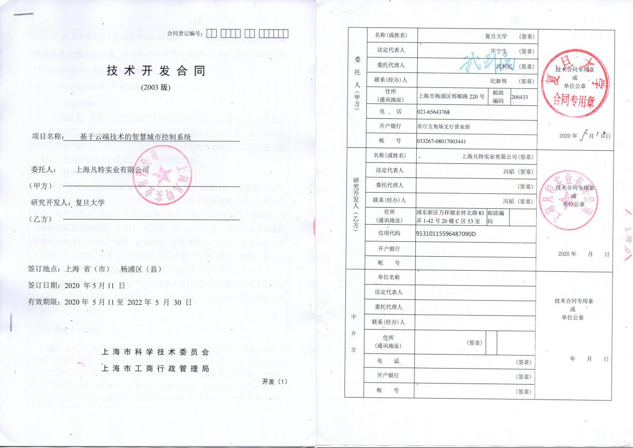同年 5月11日,上海凡特實業(yè)有限公司正式與復旦大學簽訂《技術開發(fā)合同》——基于云端技術的智慧城市控制系統(tǒng)。項目將圍繞智慧城市開展科學研究、技術開發(fā)、成果轉化及文化交流等方面的合作。這次合作一面是能夠落實國家科教興國戰(zhàn)略,促進科技創(chuàng)新,加快企業(yè)經(jīng)濟發(fā)展,充分利用高等院校的技術、人力等資源以及先進成熟的技術成果。另一面,利用企業(yè)的生產(chǎn)條件,提高教學的科研能力,將科研成果盡快地轉化為生產(chǎn)力,不斷提升企業(yè)的技術和管理水平,雙方發(fā)展各自優(yōu)勢。上海凡特通過多種形式開展全面合作,共同推進公司與復旦學校的全面技術合作,形成專業(yè)、產(chǎn)業(yè)相互促進、共同發(fā)展,努力實現(xiàn)“校企合作、產(chǎn)學雙贏”!
