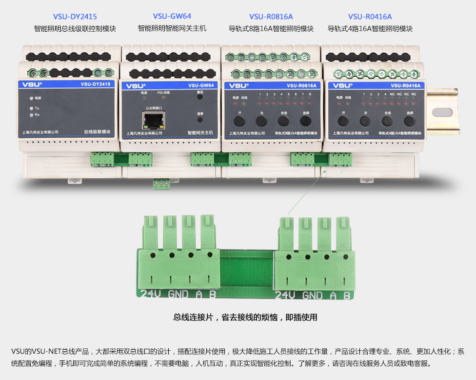 (6)網(wǎng)關(guān)主機(jī)通過(guò)網(wǎng)絡(luò)與IPAD、Andriod觸屏組成強(qiáng)大的控制系統(tǒng);通過(guò)VSU-Net總線(xiàn)與智能按鍵面板、有線(xiàn)觸屏形成可靠的智能控制系統(tǒng)。