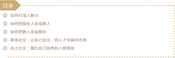 你認(rèn)識(shí)誰(shuí)比你知道什么更重要,愿意為你搭橋、為你背書(shū)、助你成功這才是真正有意義的人脈。保有一顆孩童般的好奇心,對(duì)世界、對(duì)他人真正的感興趣,渴望通過(guò)人和人的交往看到更廣闊的的世界,通過(guò)對(duì)人的深入了解而認(rèn)識(shí)他們的本真。真誠(chéng)、溫暖是敲門(mén)磚。把你的真誠(chéng)用言語(yǔ)、行動(dòng),傳達(dá)給對(duì)方,讓對(duì)方感受到你的光和溫度,被你吸引。為他人創(chuàng)造價(jià)值是引路燈,做事絕不要從利己和功利的角度出發(fā),而是首先想到如何為對(duì)方創(chuàng)造價(jià)值。