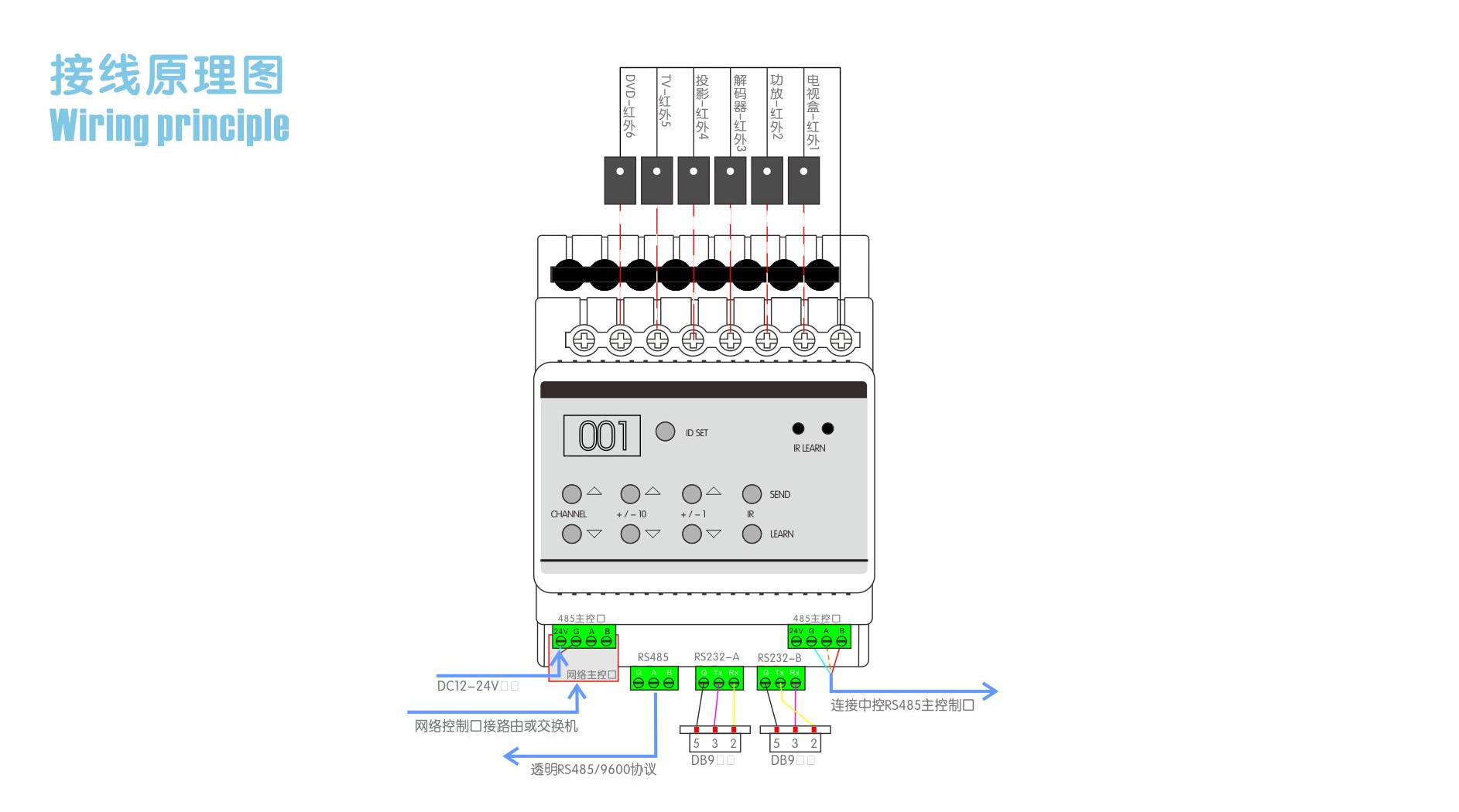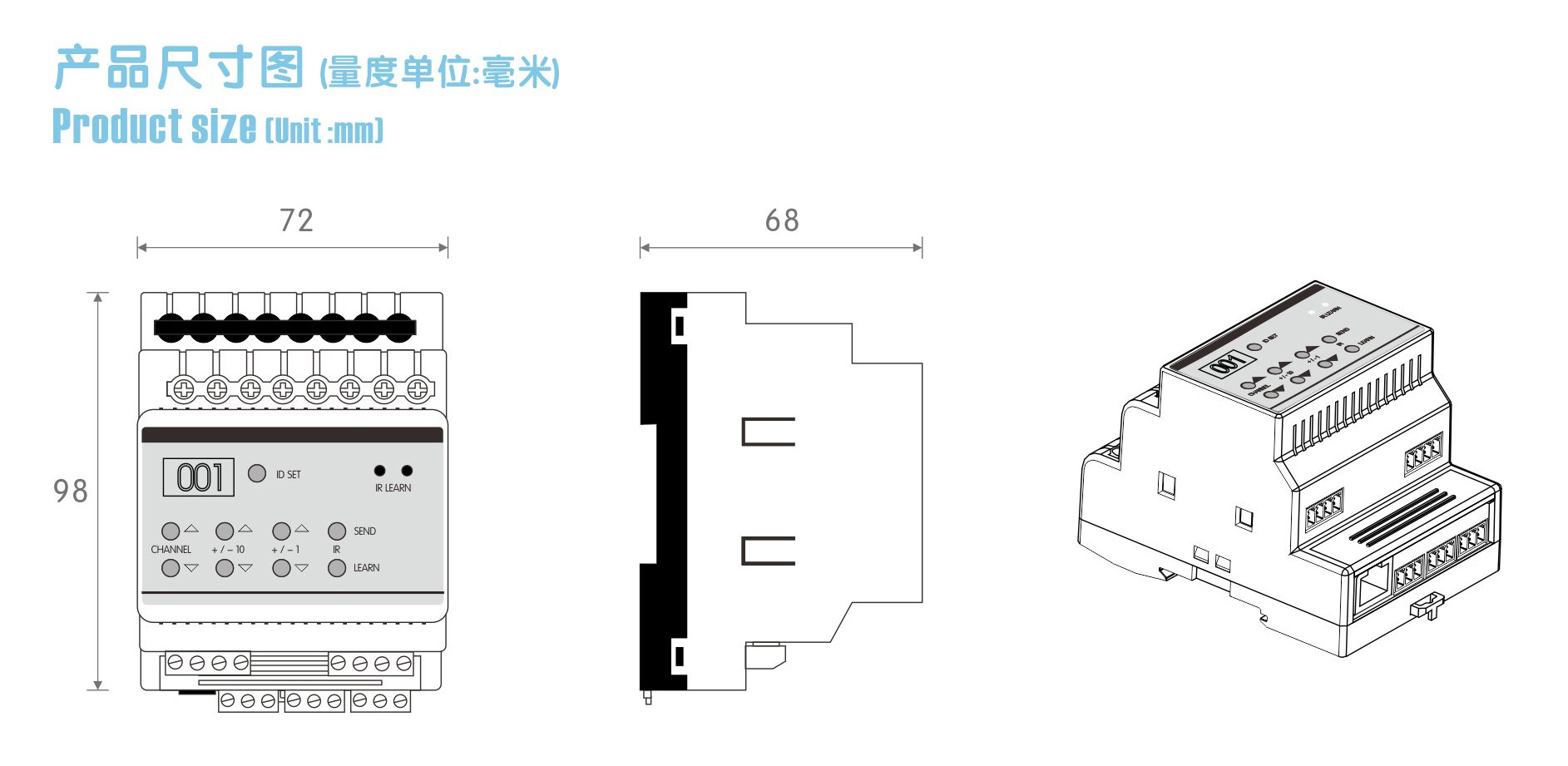 本產(chǎn)品為導(dǎo)軌式安裝,含6路紅外輸出,具備強(qiáng)大紅外能力及兼容性可控制6個(gè)紅外設(shè)備如電視、DVD、空調(diào)等,2路可編程串口控制投影機(jī)和矩陣等設(shè)備,具備強(qiáng)大紅外能力及兼容性;